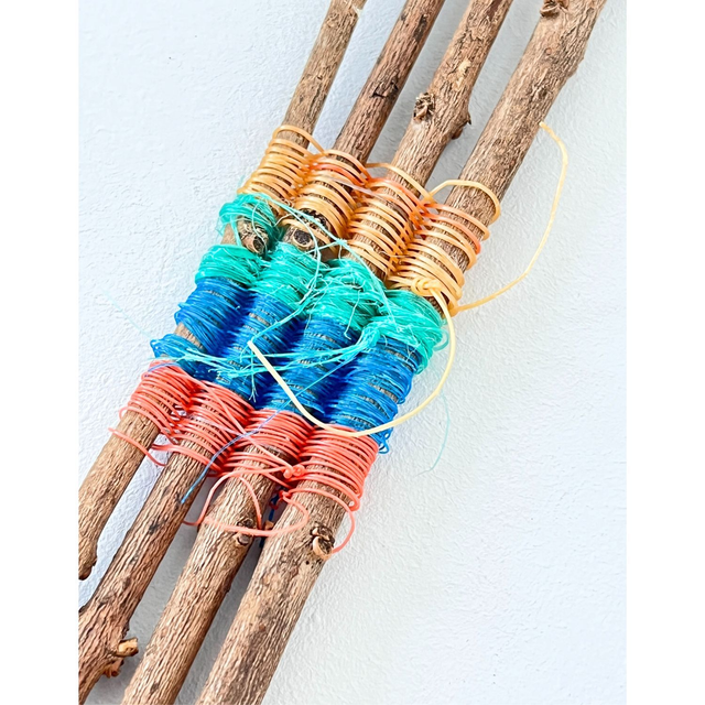 Hand constructed 3D wall sculpture made from found materials. Twigs woven with yellow, green, blue and orange rope strands sourced by hand from the coastline of Anglesey.
