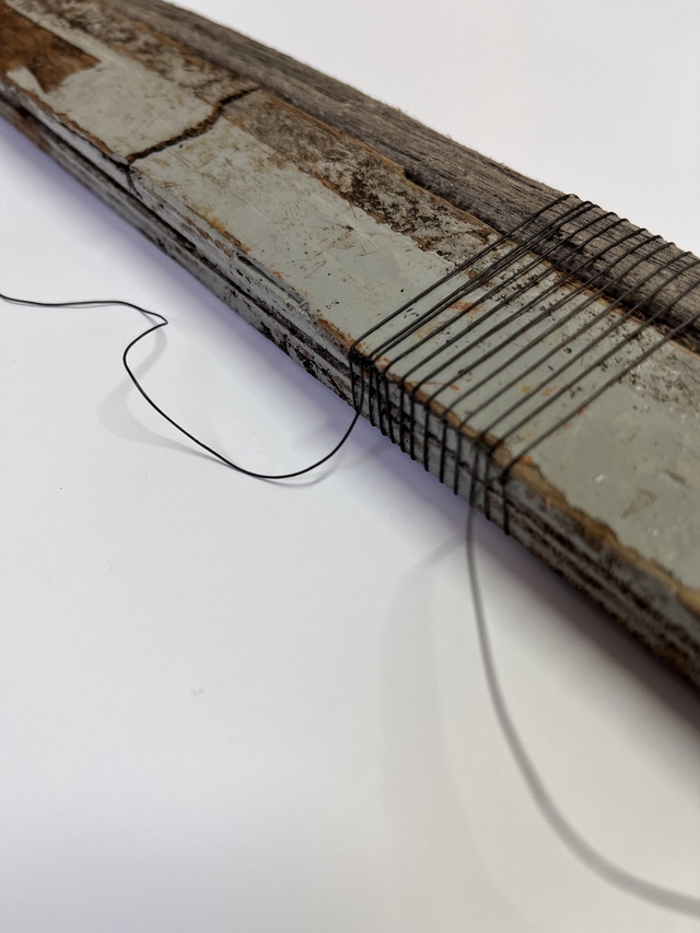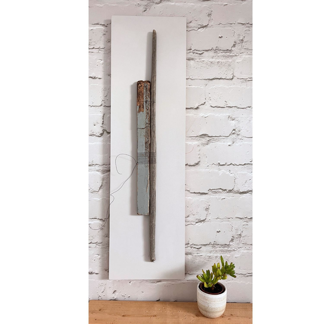 Hand-constructed wall sculpture created with materials sourced by hand from the coastline of Anglesey. Found wood bound with black rope threads.