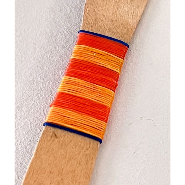 Wooden chip fork hand bound in stripes with orange, yellow and blue rope thread.