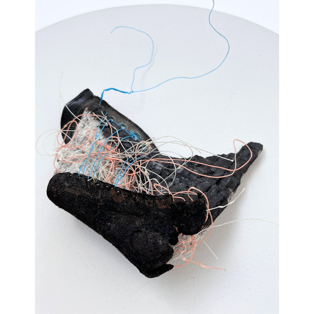 Hand-constructed wall sculpture created with materials sourced by hand from the coastline of Dungeness. Found wood and leather upper bound with orange and blue fishing line.