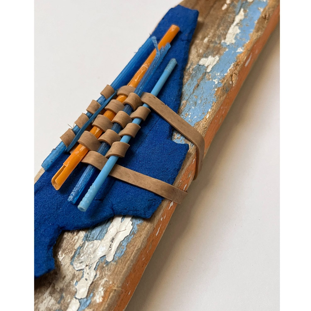 Hand-constructed wall sculpture created with materials sourced by hand from the coastline of Anglesey. Found wood, plastic straws and synthetic foam bound with rubber bands and fishing line.