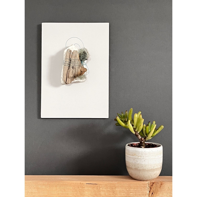 Hand-constructed wall sculpture made from found materials sourced by hand from the coastline of Anglesey in North Wales. Driftwood, plastic and rope bound with blue/green rope threads.