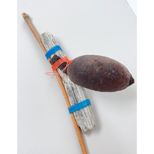 Hand constructed 3D wall sculpture made from found materials sourced by hand from the coastline of Anglesey. Plant stem and wood bound with blue and orange fishing line holding a bulb of dried seaweed.