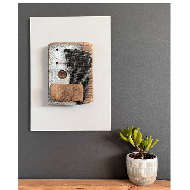 Hand-constructed wall sculpture made with found materials sourced by hand from the coastline of Anglesey. Metal plate and wood bound with orange rope thread.