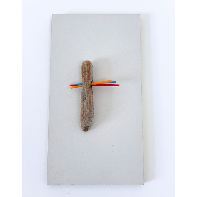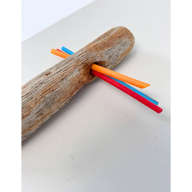 I have a collection of small, weathered wood pieces that have been washed around in the sea, their edges smoothed into their own unique form along with subtle colours and textures that surface. The piece came with a readymade hole to tightly hold the three bright, discarded straws creating a pleasing contrast and simplicity.