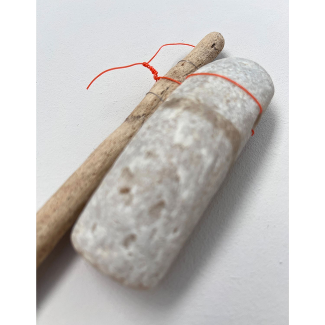The driftwood stick has a small worn branch stem attached at the top. The fibreglass block has a hole. The two were an obvious fit for each other. The orange rope has been bound and tied to ensure they stay as a couple. When constructed, it appeared as some kind of carefully crafted tool from the past with an intended but unfathomable use.
