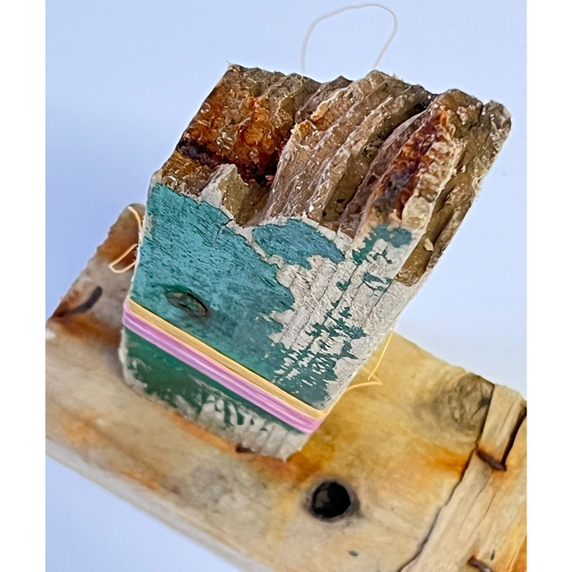 Green weathered wood block bound with knotted pink and yellow rope mounted on a wooden base.